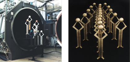 Ein kleiner Ausflug in eine gemeinsame Vergangenheit sei erwähnt als wir den Versuch gemacht haben, Kunst und Forschung zu verbinden, In diesem Fall wurden Skulpturen, von Peggy Kanacher geschaffen, durch technische Verfahren der Oberflächenveredelung modifiziert. Ich spreche hier von dem Werk „Denkdritus“, ein Kunstwort, das Peggy Kanacher selbst erfunden hat. Wenn man in ein Lehrbuch für Werkstoffwissenschaften schaut, erhält man als Definition für das Wort „Dendrit“ (ohne „k“), welches den einen Teil des Kunstwortes ausmacht, baumartig verzweigte Strukturen, die sich bei Unterkühlung einer Schmelze bilden. Dieser Wortstamm bezieht sich auf den Formgebungsprozess der Erstarrung nach Gießen von Bronze. Diese Dendriten treten im Bronzeguss auf, um sie zu sehen muss man aber mit Mikroskopen in den Werkstoff hinein schauen, was eine eigene Wissenschaftsrichtung ist. Der zweite Teil des Kunstwortes ist Denken. Denkdriten sind nun nicht Dendriten, die durch intensives Nachdenken entstanden sind, sondern eben genau diese Figuren, die Peggy Kanacher Symbolfiguren nennt. Sie sieht in ihnen die Überhöhung des Geistes, realisiert als Symbol für Forschung und Wissenschaft, in dem der Kopf hoch über den aufrecht stehenden Menschen getragen wird, strahlend und den wissenschaftlichen Erfolg des Denkens präsentierend. Darüber haben wir uns damals, 2001, die Wissenschaftler im Forschungszentrum Jülich außerordentlich gefreut. Wir haben dann voll Begeisterung diesen Figuren immer neue Ausdrücke verliehen, in dem wir ihnen durch Wahl verschiedener Werkstoffe ein unterschiedliches oberflächliches Erscheinungsbild gegeben haben. Prof. Dr. Detlev Stöver